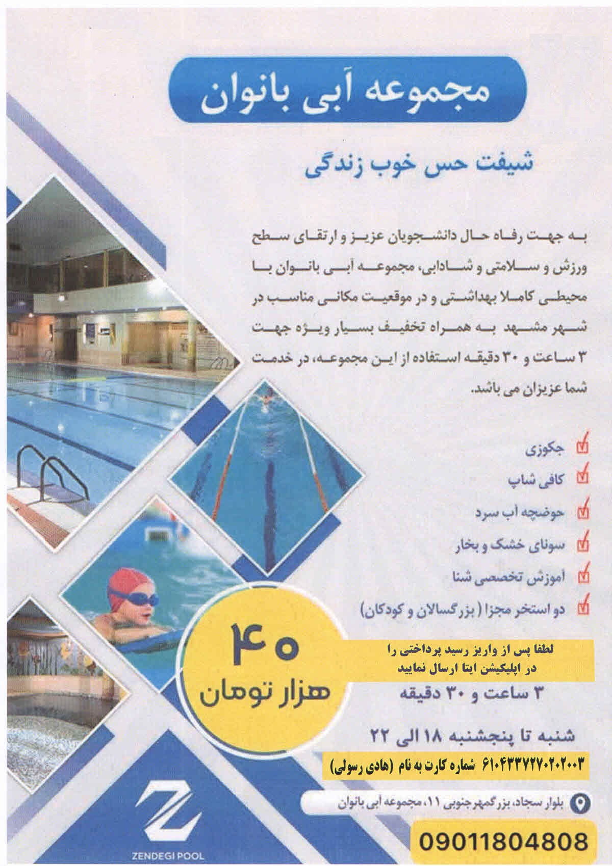 خانواده دانشگاه فردوسی مشهد(دانشجو ، کارمند و اعضای محترم هیات علمی) می توانند با مراجعه به مسول دفتر مدیریت تربیت بدنی (خانم حیدری) بلیط های مجموعه را دریافت کنند.