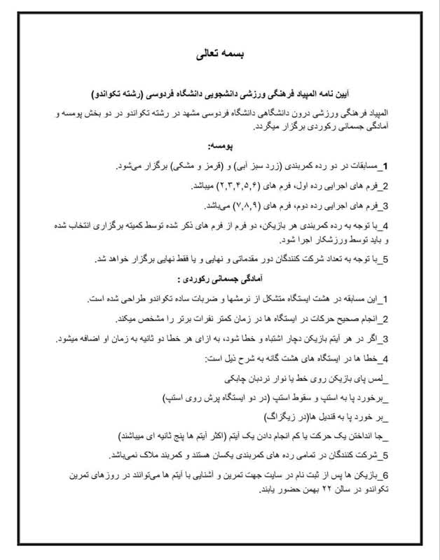 مسابقات طبق آخرین قوانین و مقررات فدراسیون تکواندو جمهوری اسلامی ایران برگزار خواهد شد.